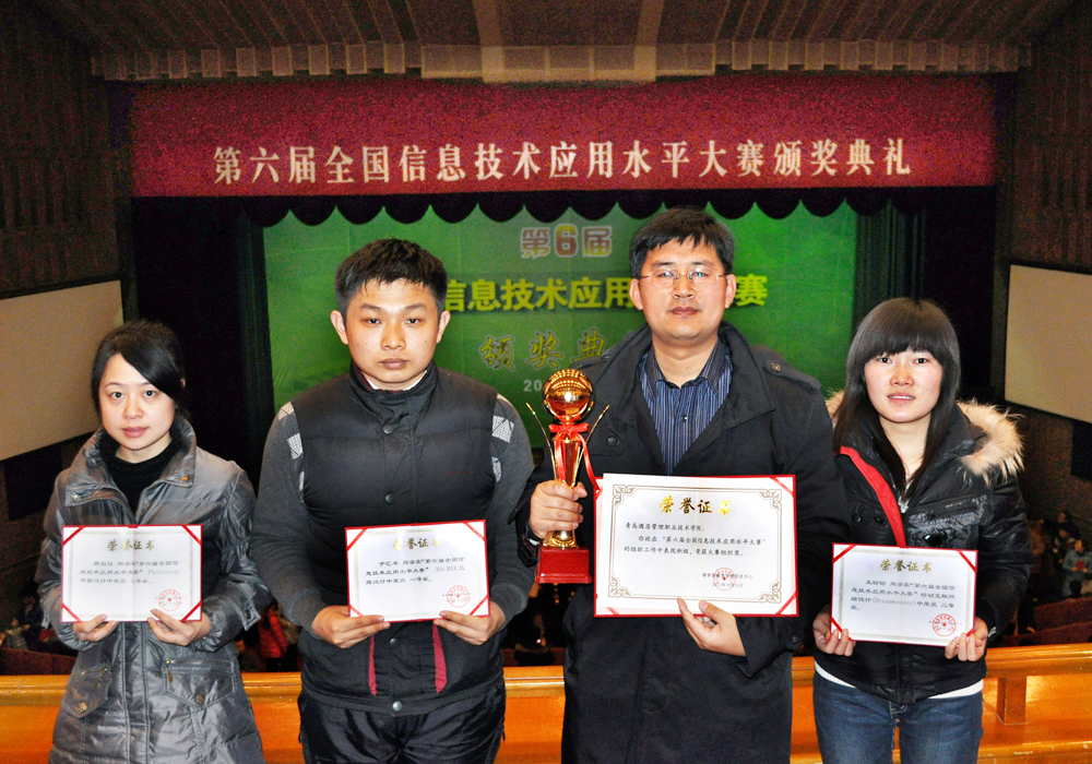 本网讯 12月20日,第六届全国信息技术应用水平大赛颁奖典礼在北京大学百年讲堂举行,中国高等教育学会会长、原教育部副部长周远清,教育部教育管理信息中心主任展涛,全国各大高等院校1800余名师生出席表彰大会。我院信息工程技术学院代表队在本次大赛中成绩喜人,于汇丰同学荣获“虚拟技术”竞赛组一等奖,王盼盼同学荣获“手机移动互联网设计”竞赛组二等奖,周启瑶同学荣获“平面设计”竞赛组二等奖,温雪老师荣获“最佳指导老师奖”,我院荣获大赛“特别组织奖”。这是我院取得的历史最好成绩,在岛城同类院校中位居第一。