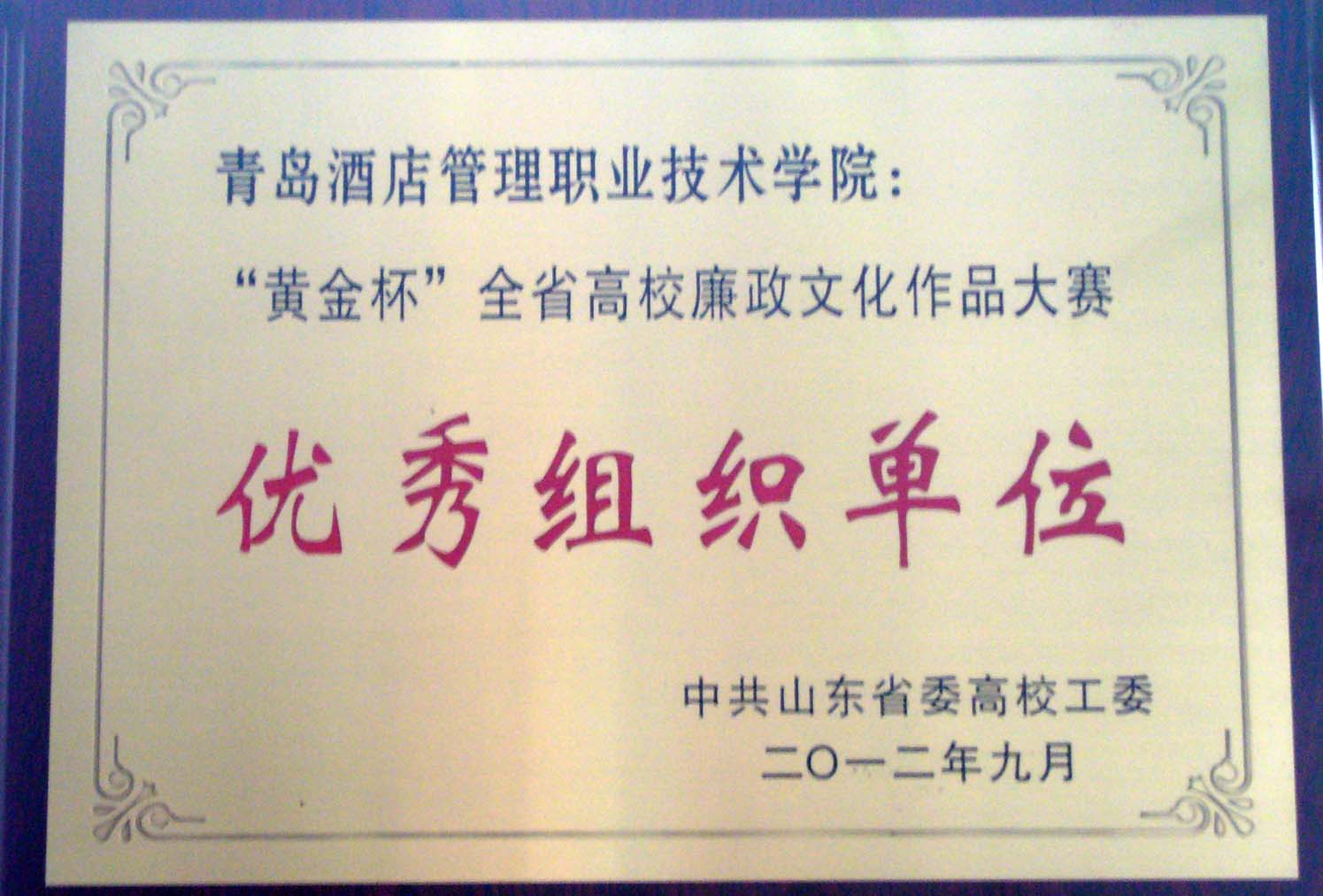 本网讯(纪检监察室王智明)日前,“黄金杯”全省高校廉政文化作品大赛总结表彰大会在山东财经大学隆重召开。学院荣获“优秀组织单位”荣誉称号;艺术学院王文院长的书法《爱因斯坦名句》、教学督导室张玉会主任的书法《无私德乃大,不贪心自安》、宣传部陈赞老师的摄影《清廉》组照分获“书画摄影类”三等奖和优秀奖;信息工程技术学院于汇丰、李文卓、范雯雯、王白雪同学共同创作的作品《蜕变》,郝晓迪同学创作的作品《一个萝卜惹的祸》分获“网络新媒体类”二等奖和优秀奖。