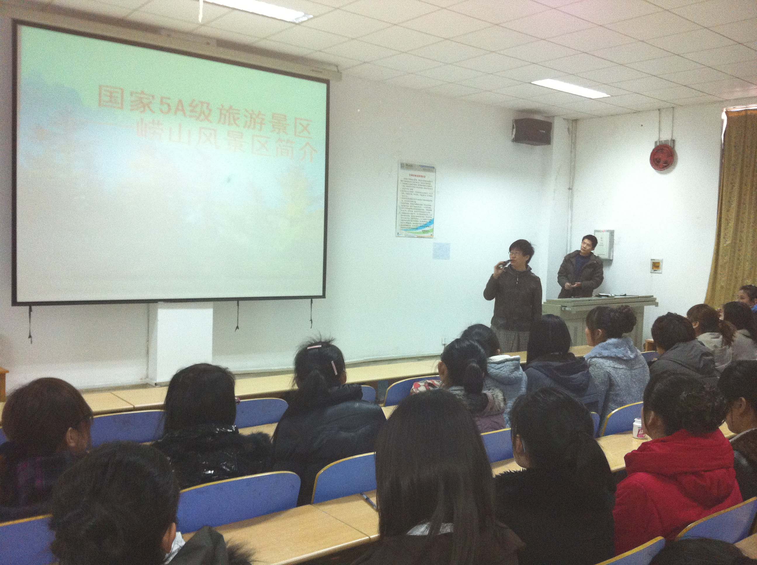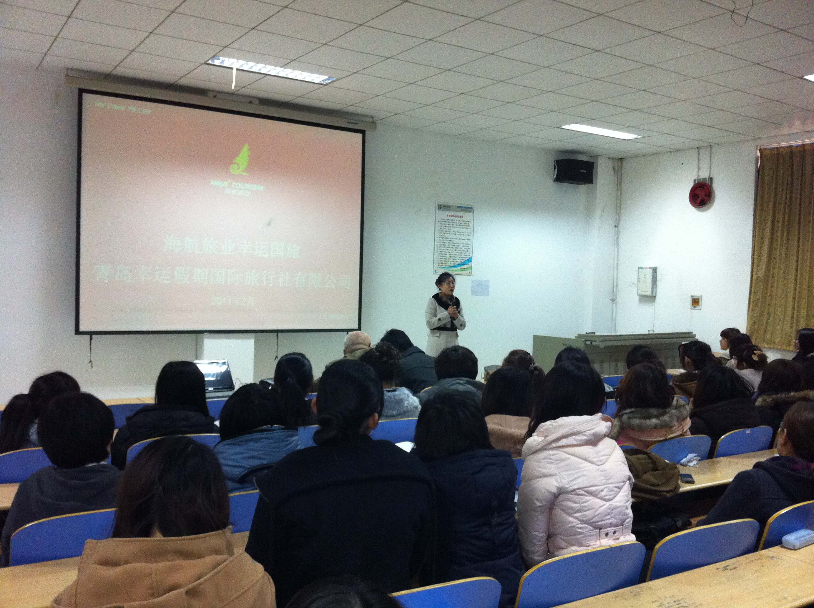 本网讯 2月28日,3月3日、4日,旅游与酒店管理学院与海航旅业幸运国旅、崂山风景区管理局、中国国旅(青岛)国际旅行社三家订单合作单位在学术楼103教室联合举办了旅游管理专业校企合作订单班推介会。海航旅业幸运国旅青岛幸运假期旅行社总经理吴强、导游部经理吕俊仕,崂山风景区管理局旅游处副处长翟凤华,中国国旅(青岛)国际旅行社副总经理王晓光、市场部经理王倩等企业老总进行了订单推介。旅游与酒店管理学院副院长张峰出席宣讲推介会。推介会由旅游管理专业负责人石媚山主持。旅游管理专业全体同学参加了推介会。