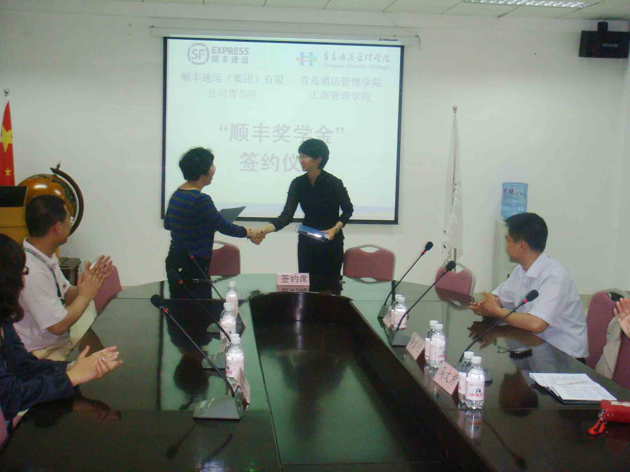 本网讯 5月19日下午,工商管理学院第二届顺丰订单培养工作开班仪式在图书馆308会议室举行,工商学院党总支副书记冷雪艳及顺丰速运集团青岛区人力资源部赵梅莉主任出席仪式并代表双方签订了“顺丰奖学金”合作协议,顺丰订单班部分学生代表参加了开班仪式。