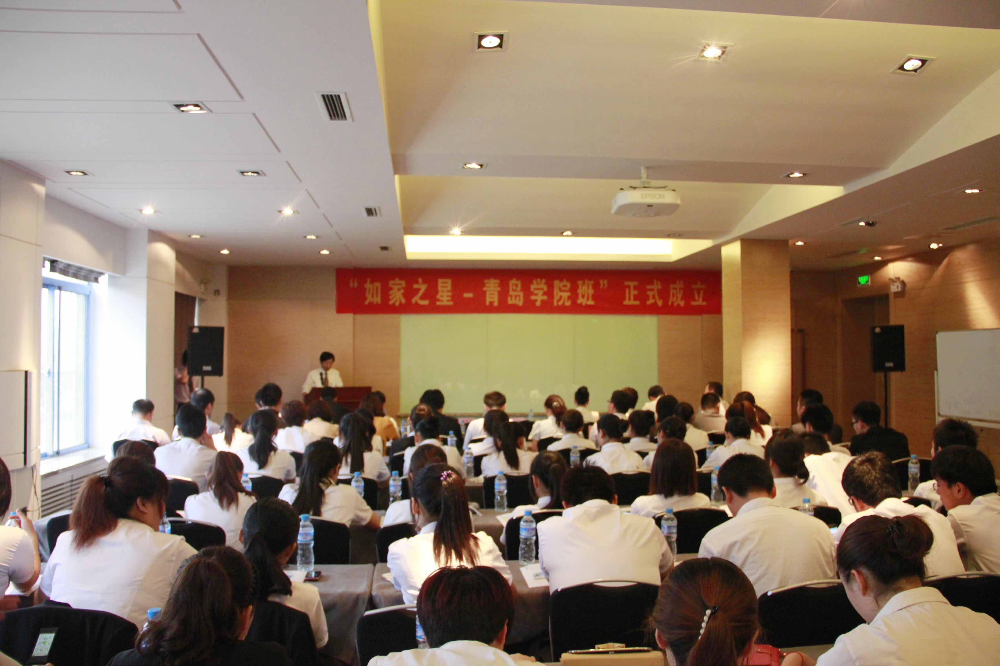 本网讯 7月5日上午,“如家之星-青岛学院班”成立仪式在旅游与酒店管理学院实训中心多功能厅举行,从我院2011级酒店管理专业中选拔的80位同学成为了“如家之星-青岛学院班”的第一期学员。如家酒店集团管理大学校长包小阳、如家山东区域总经理李军,我院常务副院长张志东、副院长陈秋、教务处处长刁洪斌,以及二级学院的相关老师出席了成立仪式。