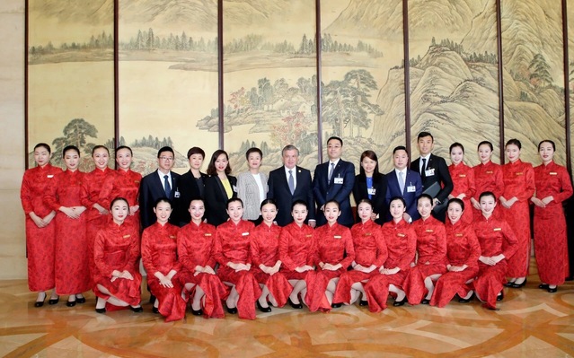 高源檬(第二排右三)、苗苗(第二排右四)与乌兹别克斯坦总统米尔济约耶夫合影