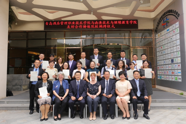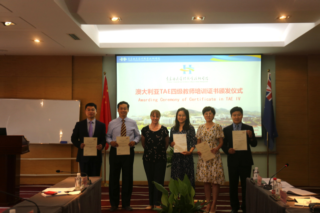 本网讯(国际交流与合作处 邵常恩)7月20日上午,我院和澳大利亚南澳技术与继续教育学院(TAFE SA)在旅游与酒店管理学院实训中心多功能厅举行友好合作姊妹院校揭牌仪式暨TAE40116四级教师培训证书颁发仪式。