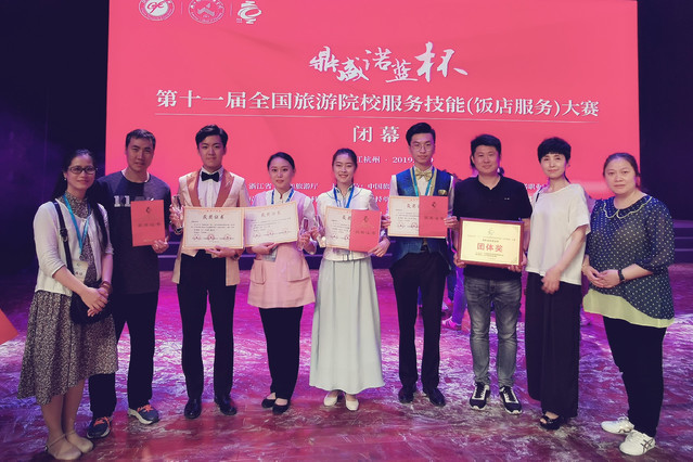 本网讯(旅游与酒店管理学院 王翔)5月16日至19日,2019年“鼎盛诺蓝杯”第十一届全国旅游院校服务技能 (饭店服务)大赛在浙江旅游职业技术学院举行,学院学子张朝辉、宋晓东、万晓彤分别获得中餐宴会摆台、西餐宴会摆台、客房服务赛项金牌,孙明浩获得鸡尾酒调制赛项银牌,我院参赛团队以总分排名全国第三的优势获得高职院校组团体奖。