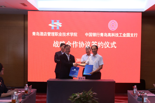 王建宝和朱雨顺代表双方签署了战略合作协议。根据协议内容,中国银行青岛市分行以高科园支行为主要实施单位与学院将本着“平等互利、优势互补、相互支持、共促发展”的原则,建立长期、稳定、互惠、互利的合作关系,在助学贷款、金融业务服务、订单培养、师资共享、业务培训、实习基地建设、金融产品研究与开发等方面开展深入的交流和合作,实现教育与金融融合发展,共同提升。