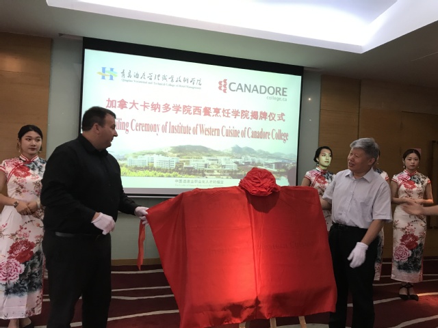 李达与理查德共同为西餐烹饪学院揭牌。此次西餐烹饪学院的揭牌,标志着两校间的合作迈上了新的台阶,卡纳多学院将在目前的基础上,输出西餐烹饪课程标准,派出优秀的西餐专业教师来华进行展演和授课。