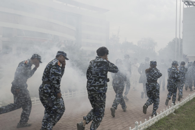 中午13时,消防演练正式开始,演练场景假设校园教学楼和宿舍楼发生火灾,火势蔓延迅速,同学们在老师组织下用帽子、毛巾捂住口鼻,弯腰低姿从教学楼、宿舍楼有序进行撤离,不到三分钟的时间,全体学生全部撤离危险区域,到达指定集合地点。整个演练过程井然有序,切实提高了师生的理论水平和实际操作能力。