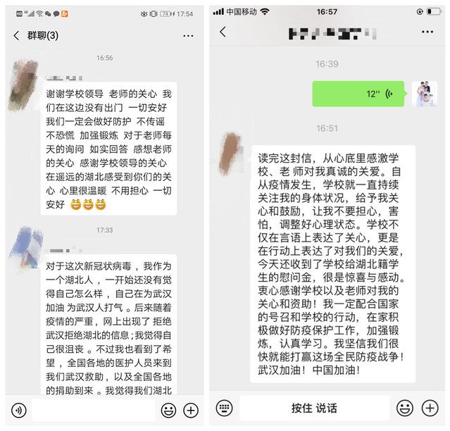 “大疫见真情,天寒暖人心。在这里我要感谢学院的各位老师,感谢您们对我的关心与支持!我居住在湖北的一个农村,可今年因为疫情的爆发……,学院给我发来了慰问金,让我的家庭度过这一难关能轻松不少。”收到一封信和慰问金后,2018级财务管理专业湖北籍张同学给辅导员的留言中说。收到辅导员的信息和学校的慰问金,同学们或将慰问金补贴家用,或捐赠出去帮助他人,并纷纷留言表示感谢,表示在家积极配合做好隔离工作,做好一个大学生的日常,不忘学习,为开学做准备,并力所能及地贡献自己的力量,共克时艰。