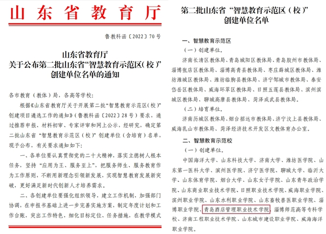 本网讯(教育信息中心 杨贞帼)近日,山东省教育厅发布了《关于公布第二批山东省“智慧教育示范区(校)”创建单位名单的通知》(鲁教科函〔2022〕70 号),我校成功入选。