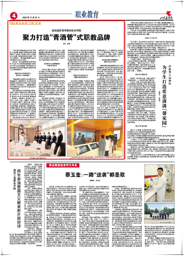 本网讯(党委宣传统战部)11月21日,《山东教育报》第4版以《青岛酒店管理职业技术学院聚力打造“青酒管”式职教品牌》为题,报道学校坚持“聚焦酒店业办专业”的思路,精准对接产业链岗位能力要求进行专业设置、组建专业群,聚力打造“青酒管”式职教品牌的经验做法。全文如下: