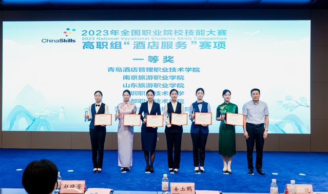 大赛总裁判长胡晓教授就比赛整体情况进行点评并宣布成绩。其中,6所参赛院校荣获团体一等奖,12所参赛院校荣获团体二等奖,19所参赛院校荣获团体三等奖;来自青岛酒店管理职业技术学院、南京旅游职业学院、山东旅游职业学院、深圳职业技术学院、成都职业技术学院、浙江商业职业技术学院的12名教师荣获“优秀指导教师”。在欢快的乐曲声中,姜玉鹏等与会领导为获奖院校和优秀指导教师颁奖。
