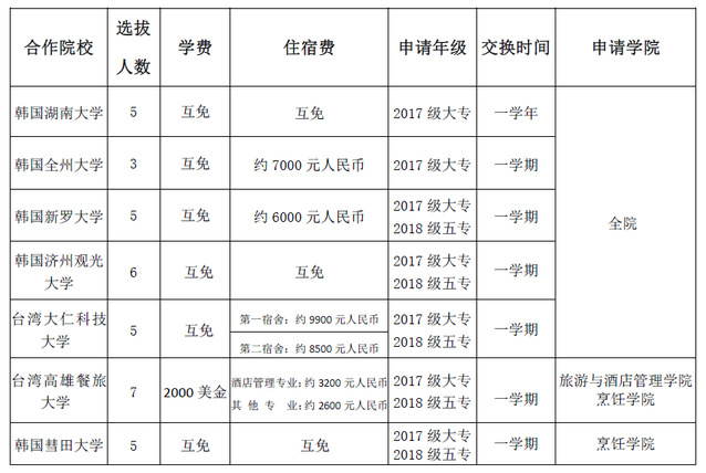 根据我院与韩国湖南大学、韩国全州大学、韩国新罗大学、韩国济州观光大学、台湾大仁科技大学、台湾高雄餐旅大学、韩国彗田大学的合作协议,经研究,拟选派部分学生公派到境外交流学习,学习时间为一学期到一学年不等。本着公平、公正、公开的原则,现将下学期赴境外公派交换生选拔方案予以公布: