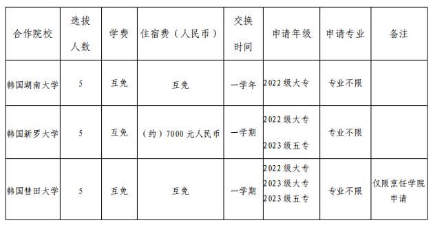 1.韩国新罗大学、韩国湖南大学需继续参加交换学校的专升本项目;如因个人原因放弃后续学习,需补缴交换学习期间减免的相关费用。