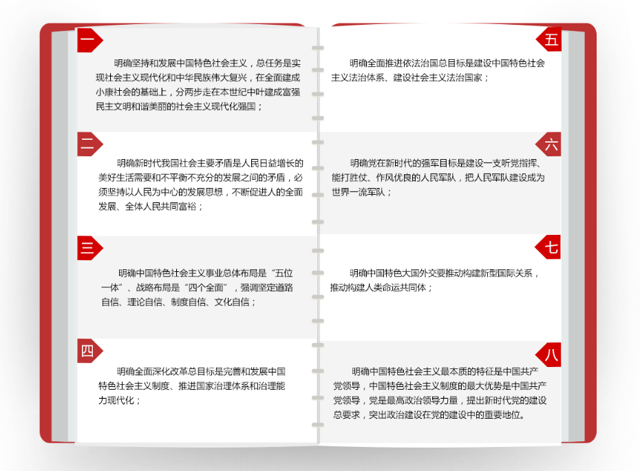 (六)坚持全面依法治国。全面依法治国是中国特色社会主义的本质要求和重要保障。必须把党的领导贯彻落实到依法治国全过程和各方面,坚定不移走中国特色社会主义法治道路,完善以宪法为核心的中国特色社会主义法律体系,建设中国特色社会主义法治体系,建设社会主义法治国家,发展中国特色社会主义法治理论,坚持依法治国、依法执政、依法行政共同推进,坚持法治国家、法治政府、法治社会一体建设,坚持依法治国和以德治国相结合,依法治国和依规治党有机统一,深化司法体制改革,提高全民族法治素养和道德素质。