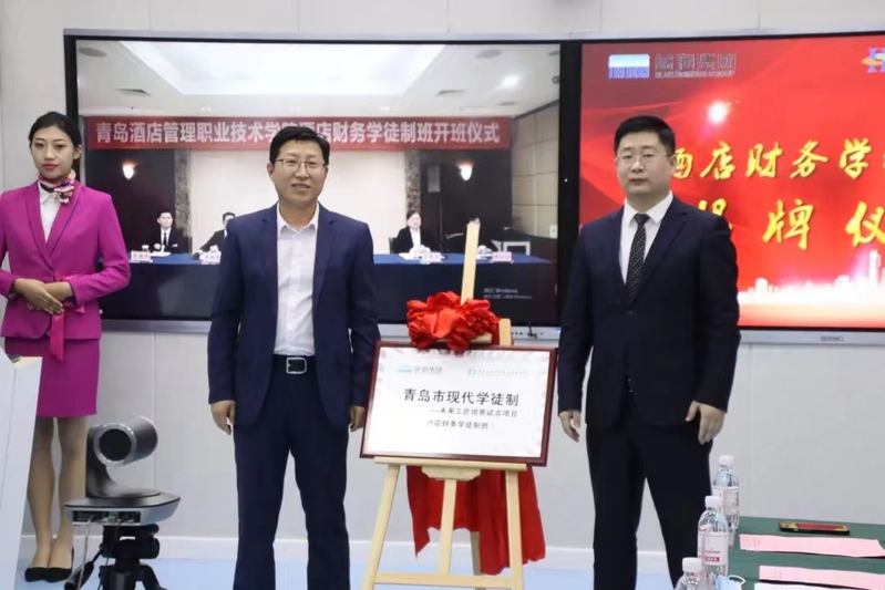 仪式上,张宗国与青岛蓝海大饭店(李沧)副总经理张小保共同为“酒店财务学徒制班”揭牌。校企双方共同宣布企业师傅名单及师徒结对名单并举行拜师仪式,学徒向企业师傅行拜师礼,企业师傅为学徒佩戴工卡、赠送礼物。