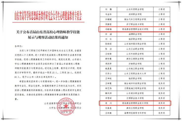 近日,首届山东省高校心理教师教学技能展示与观摩活动在聊城大学举办。我校文旅学院冯皓楠老师获二等奖、酒店工程学院庞川老师获优秀奖。