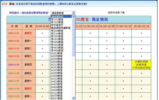 为满足各二级学院和职能部门相关活动的多媒体使用需求,充分发挥多媒体设备功效,课余时间内多媒体教室一直按《青岛酒店管理职业技术学院课余时间多媒体教室使用管理制度》规范有序使用。为进一步实现多媒体教室课余时间使用的信息化管理,教育信息中心指派专人开发出“课余时间多媒体教室使用预约查询系统”,现予以正式启用,请课余时间申请使用多媒体教室的老师提前查询。