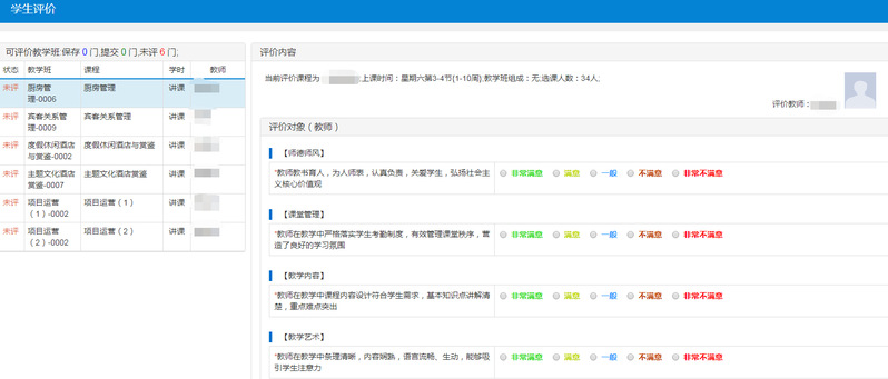 3.界面左侧显示本学期参评的课程和被评教师姓名,右侧显示评价指标。